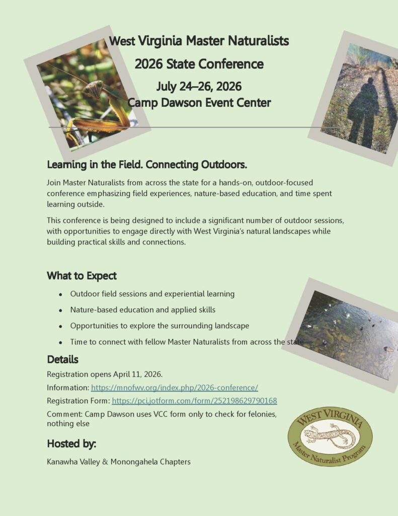 Join Master Naturalists from across West Virginia for a weekend of learning, field experiences, networking, and fellowship at beautiful Camp Dawson.